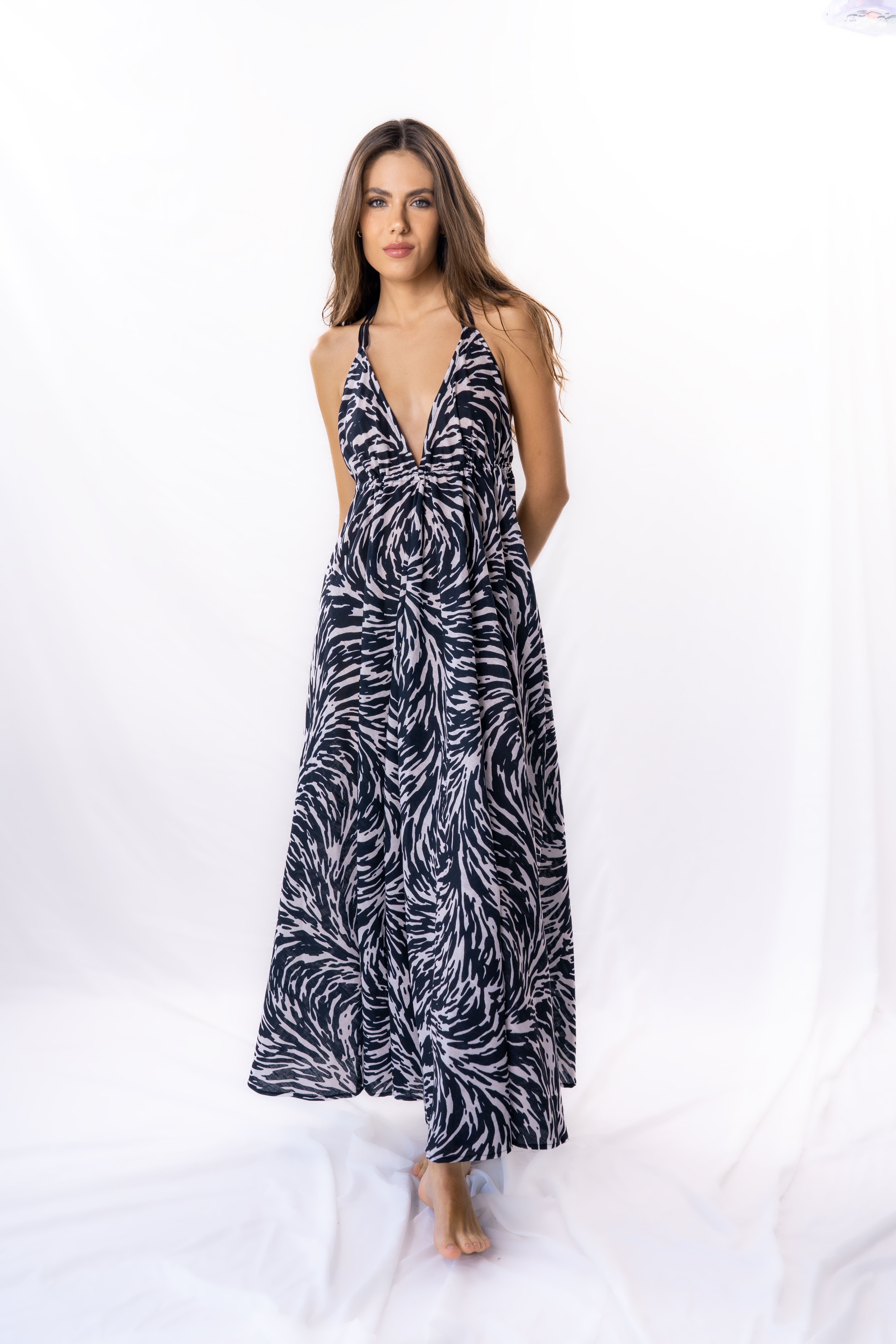 Vestido largo de playa con silueta fluida y escote en V profundo que estiliza la figura. Confeccionado en tejido liviano con estampado orgánico en tonos oscuros, aporta movimiento y una estética sofisticada. Su diseño sin estructura permite una caída natural, ideal para transiciones entre playa y resort. Incorpora detalles bordados a mano, reforzando el carácter artesanal de la colección Kenitra.
