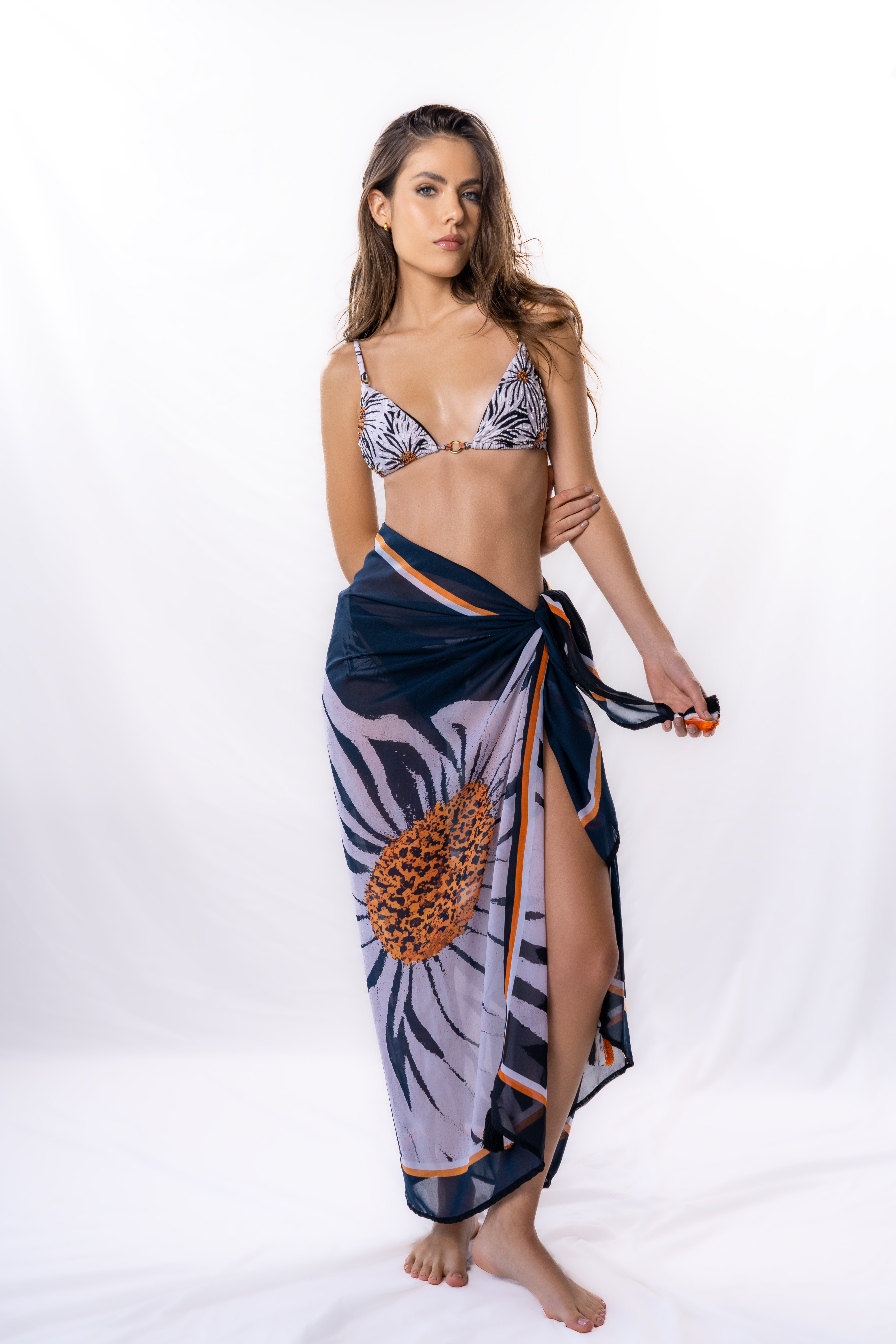 Cover up tipo pareo diseñado para aportar movimiento, sensualidad y versatilidad al look de playa. Su formato permite múltiples formas de uso, adaptándose al cuerpo de manera fluida y natural. El estampado botánico de gran formato crea un efecto visual impactante. Ideal para usar sobre el bikini o como pieza protagonista en un look resort.