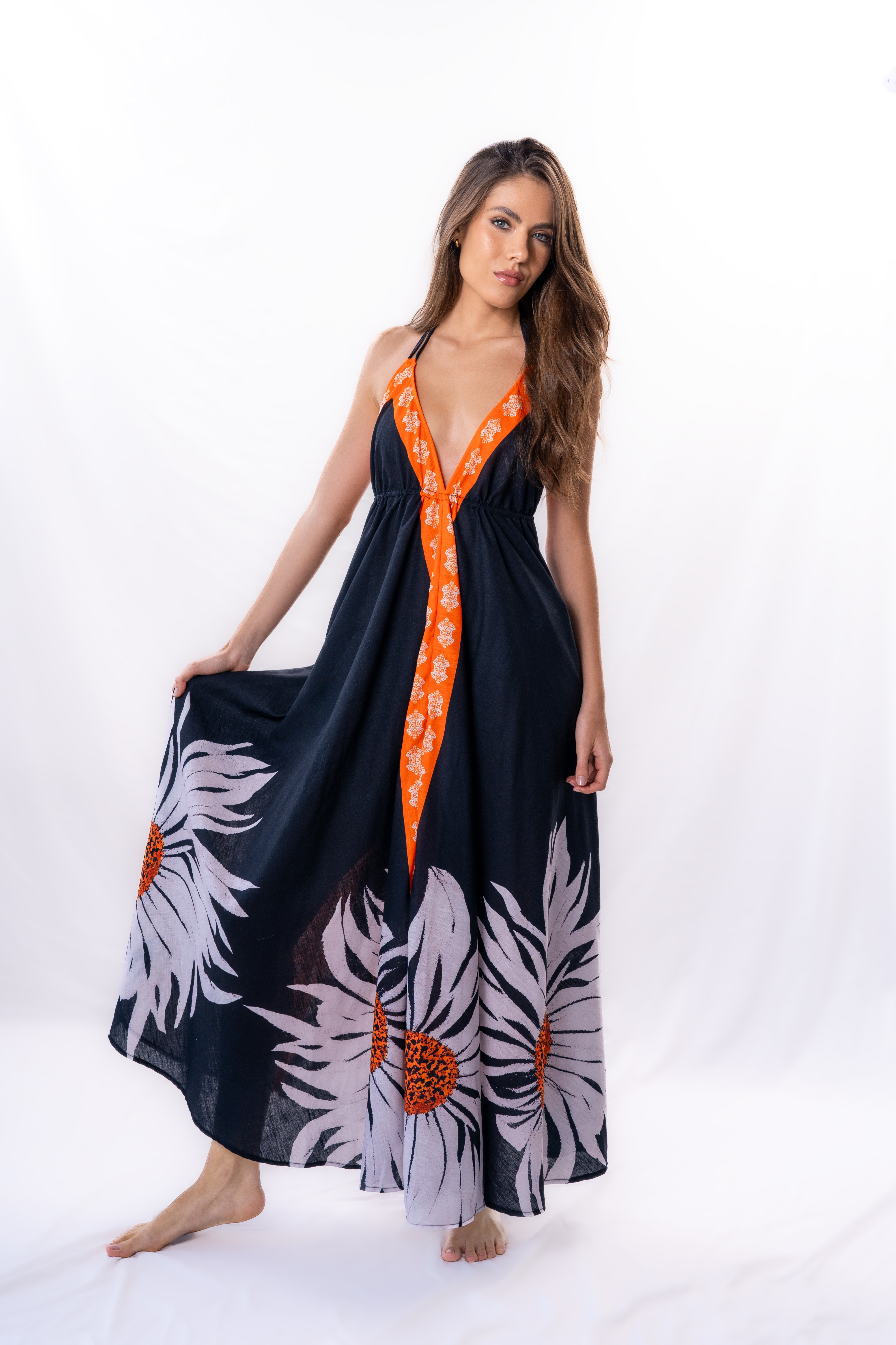 Vestido largo tipo cover up diseñado para acompañar el bikini Tinif con elegancia y fluidez. Su escote profundo estiliza la silueta, mientras que el corte amplio permite movimiento y frescura. El estampado floral se integra con detalles bordados a mano, reforzando el carácter artesanal de la pieza.